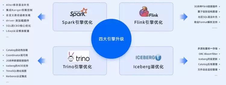 袋鼠云作为国内领先的数字化基础软件与应用服务商,十分重视强化产品的基础能力和技术能力,在开源技术的基础上,EasyMR 对 Spark、Flink、Trino、Iceberg 等多个大数据核心组件进行了功能及性能增强。具体优化见下图: