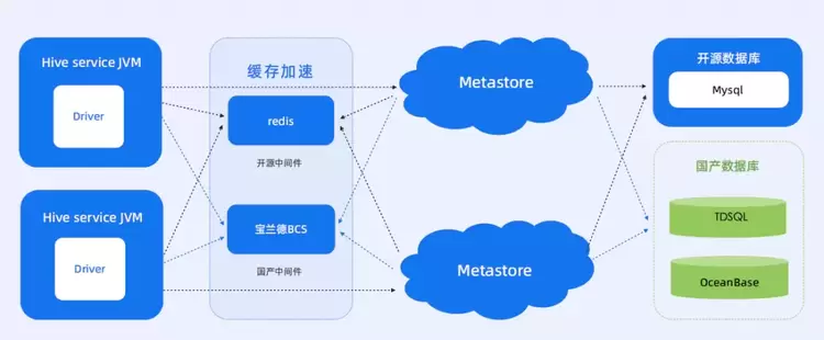 Hive 的子组件 Hive Metastore,在开源的方案中通过 redis 进行缓存加速,而现在可以通过宝兰德BCS 这样的国产中间件对 redis 进行国产化替代。