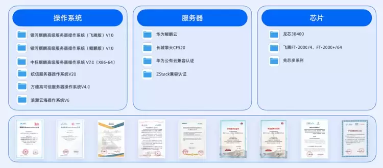 EasyMR 完成了与主流信创生态厂商的适配互认工作,支持统信UOS、龙蜥、麒麟等国产操作系统,鲲鹏920、飞腾等国产芯片,长城擎天CF520、华为公有云等国产服务器的适配,以及大部分国产数据库、国产中间件的适配。