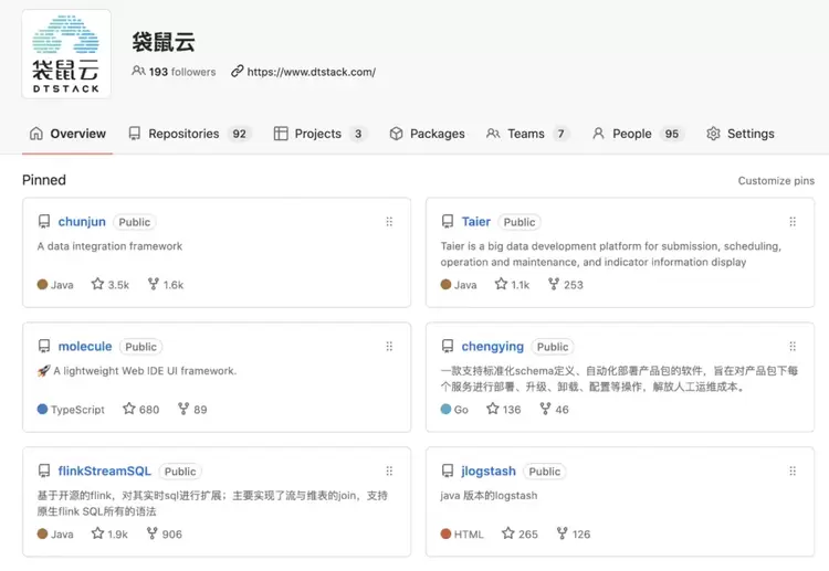 从2016年数栈V1.0发布开始,到如今的数栈V6.0,数栈已经历经了七年六个大版本的迭代实践。随着对技术能力的不懈探索,数栈内部也沉淀了一些优秀的大数据组件,如流批一体的数据同步集成组件ChunJun,DAG分布式任务调度组件Taier、大数据平台运维组件ChengYing等,这些组件数栈已经全部贡献给了Github,下面是袋鼠云开源的地址,欢迎使用。