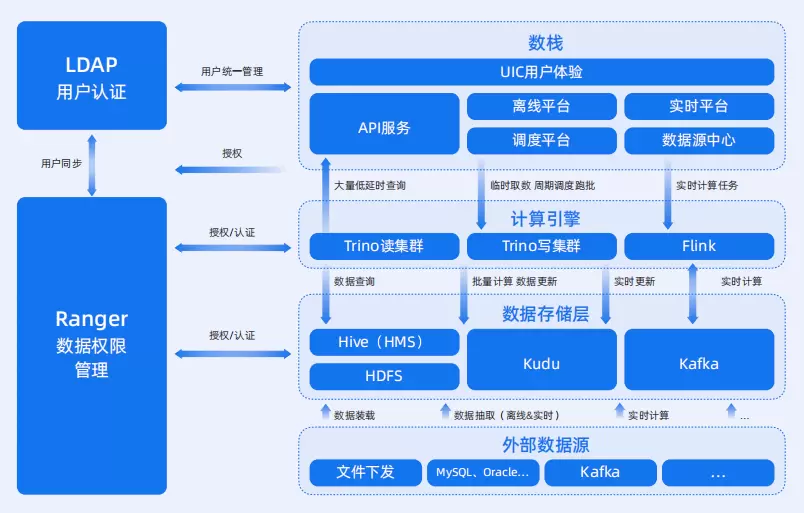 通过 LDAP+Kerberos+Ranger 这套认证权限体系,对库/表/行/列级进行权限控制,实现企业级安全管控。