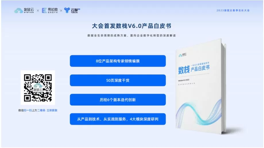 此外,会上还发布了《数栈产品白皮书》,从数字技术、产品能力、应用实践、服务支持四个方面进行深度研判,针对性克服数字化转型短板,从数据治理、湖仓一体、数据集成、DataOps 等八个方面进行解决方案解读,重点提升客户数据管控能力。此外,本白皮书总结了有效的大数据基础软件建设经验,为各行业企业的数字化转型提供参考和指导。