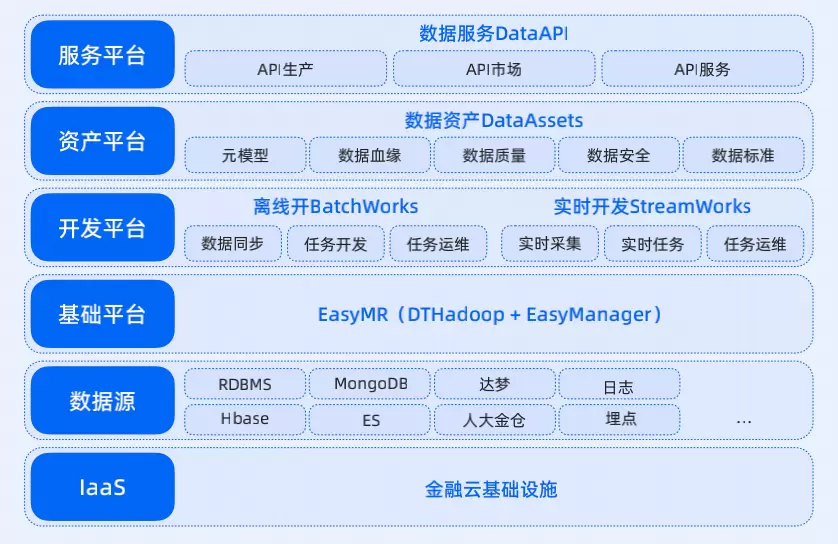 中间层大数据开发与治理,它融合了 DataOps 数据理念,包含离线开发BatchWorks、实时开发StreamWorks、数据服务DataAPI、数据资产DataAssets和指标管理DataIndex 五大模块。以自主可控、安全创新为技术内核,将全域数据资产进行汇聚、加⼯、治理、服务、分析,为客户提供安全、稳定、易⽤的⼤数据平台,加速释放数据价值,赋能数智应用。