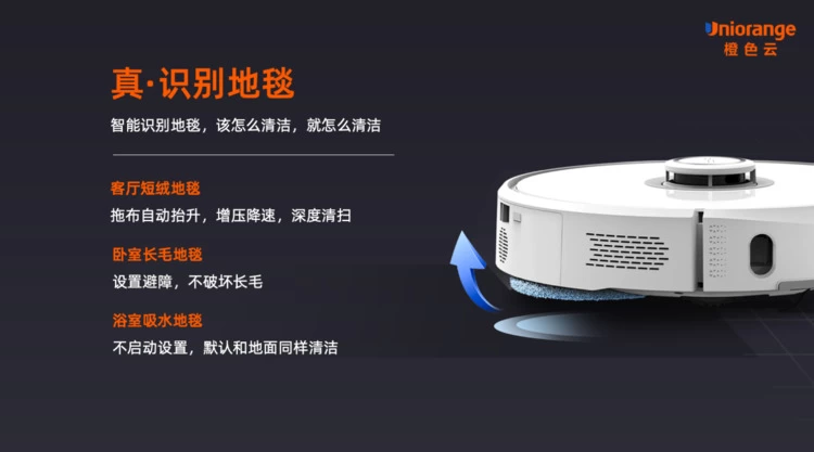 面对越来越多现代家庭设置的“地毯区”,为了做到在清洁地毯的同时又不打湿地毯,橙色云通过对数十种不同材质、不同厚度的地毯进行反复测试,最终在i2上采用了全向浮动旋转拖布提升技术,来实现拖布的自动升降。此外,在返回基站清洗时,i2的拖布智能抬升功能还能有效避免二次污染。