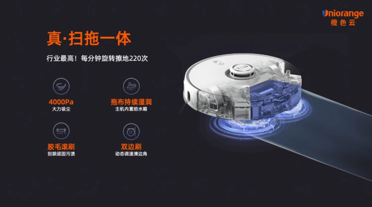 在为消费者带来省心的同时,橙色云i2在最核心的清洁能力上同样不遗余力。作为橙色云推出的旗舰产品,4000pa的强大吸力配合全向浮动胶刷模组,并将拖地频率提高到220r/min,能够有效去除顽固污渍;动态调速3爪双边刷的加入,可以在边角与开阔场景自动调节转速,在不打飞垃圾的同时获得更好的边角清洁表现;橙色云i2主机内置的小水箱,能够让拖布时刻保持湿润,避免越擦越干。