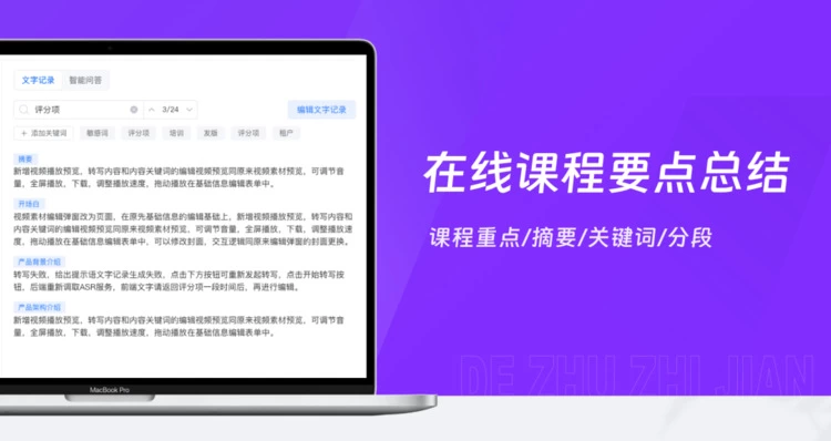 基于大模型的内容生成和处理能力,自动从非结构化的素材资料(文档、图片、音视频等)中归纳课程要点和大纲,有效提升学员学习效率。