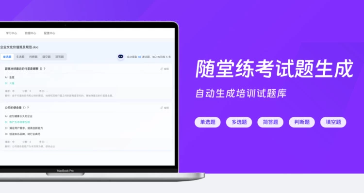 大模型的内容自动生成能力,可以对 Word、PDF、PPT和音视频资料进行深度分析,自动生成培训试题库,供学员随堂练、刷题、考试。