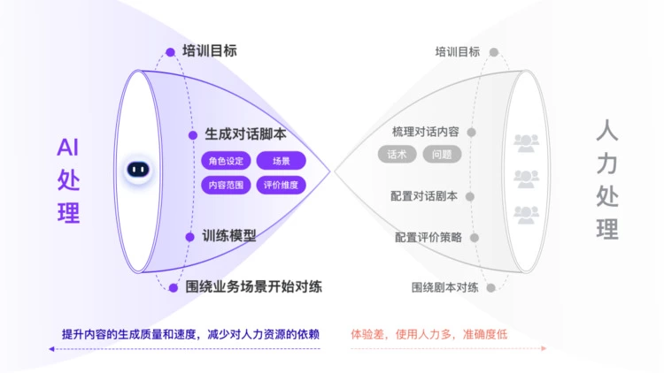 在企业业务话术培训场景,使用大模型技术搭建的个性化陪练机器人,让学员在和AI机器人的对练过程中不断熟悉掌握沟通方式和优秀话术,可实现传统培训方法难以达成的灵活性、自主化、个性化的培训模式与效果。