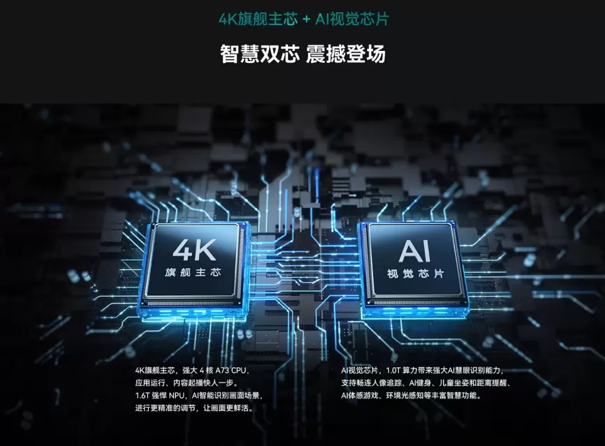 华为智慧屏S3 Pro搭载全新的智慧双芯,一颗4K旗舰主芯可带来性能和画质的全面升级,另一颗AI视觉芯片为新潮前沿的智慧体验了提供卓越性能基础。从性能来看,依托4K旗舰主芯,华为智慧屏S3 Pro相较市面同价位的主流产品,在开机、应用启动速度、操作流畅性上都更胜一筹、快人一步。更重要的是,4K旗舰主芯可支撑华为自研算法鸿鹄画质的高清呈现,其拥有的1.6TOPS的NPU单元,将带来鸿鹄AI HDR增强、鸿鹄AI精晰超分和强大的场景识别能力,可对画面的清晰度、对比度、色彩、流畅度全面优化,更好还原真实世界的亿万色彩、明暗细节,为用户带来非凡的影像视觉体验。