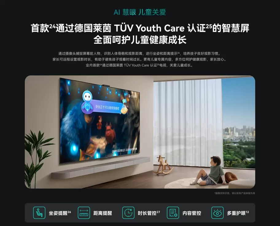 通过AI视觉芯片和超广角的AI摄像头的超强组合,华为智慧屏S3 Pro不仅可让用户轻松玩转AI健身、AI体感游戏,对有孩子的家庭用户来说,打开儿童模式还可精准识别孩子坐姿是否不当/距离是否过近,为孩子提供优质、健康的观看体验。因华为智慧屏S3 Pro全方位呵护儿童的健康成长的理念,让其荣获行业首款莱茵Youth Care认证。当然,华为智慧屏S3 Pro不仅具备儿童关怀,同时也在适老化的道路上不断探索,产品支持的远程协助功能,可通过手机远程访问智慧屏,远隔千里也可轻松帮助家中长辈解决操作困惑,让关爱跨越千里。