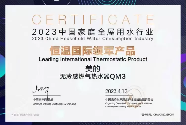 2023年是贯彻党的二十大精神的开局之年,扩内需促消费系列政策逐步见效,消费市场发展韧性持续显现,居民消费需求将不断释放,燃气热水器产品需求进一步得到提升。美的始终以用户为中心,不断迭代优化恒温技术,从而为用户提升用水舒适度,体验品质用水生活方式。在本届论坛上,美的凭借深厚的技术积淀和亮眼的产品表现,一举斩获2023中国家庭全屋用水“热水器类行业贡献主流品牌”、“创新无冷感产品”、“恒温国际领军产品”三项殊荣,充分验证着美的家庭用水产品受到行业和消费者的广泛认可和良好的市场反馈。