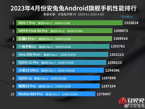 5月1日,安兔兔官方微博正式公布4月安卓旗舰手机性能榜排名。全新发布的ROG 7 Pro以平均1325814分的成绩疯狂“屠榜”,以明显优势再度刷新安卓手机最高跑分记录。
