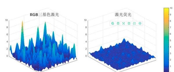 有些三色激光虽然可以带来高饱和度的画面,但是无法摆脱光线相干性造成的画面散斑现象;散斑就是“激光照射到粗糙物体表面时,从粗糙物体表面反射或透射的散射光会在传播过程中相干叠加,在空间形成随机无规则分布的亮斑和暗斑,称之为激光散斑。”有研究说明,有散斑的画面对人眼睛的伤害是成倍的,光强越强对人眼的伤害也就越大。