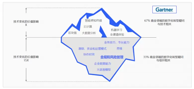 Gartner对“技术作用于企业价值创造”的一项专项研究表明:大部分管理者关注的技术问题相当于水面上的冰山,包括大家已经耳熟能详的一些技术定义跟概念,包括云、大数据、物联网等等;少部分管理者关注的企业转型问题深埋在水面之下,包括业务技巧与专长能力、资金和运营模式、合规和风险管理等等。而水面之下的“冰山”对企业数字化转型的价值影响15倍于水面之上的部分。