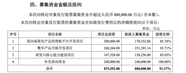 据北汽蓝谷发布的公告显示,此次定增拟非公开发行股票募集资金不超过80亿元,用于面向场景化产品的滑板平台开发项目、整车产品升级开发项目、研发与核心能力建设项目及补充流动资金。