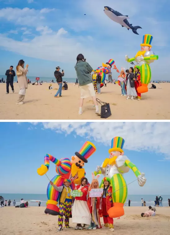 如果你在这个时候踏上那香海的沙滩,你会发现这里已经成为风筝的海洋。各式各样的风筝自由飞舞、活力炫动,时而转换方向、时而变换动作,仿佛天空的花朵,吸引着每颗童心,欢跃着追逐蓝天白云。