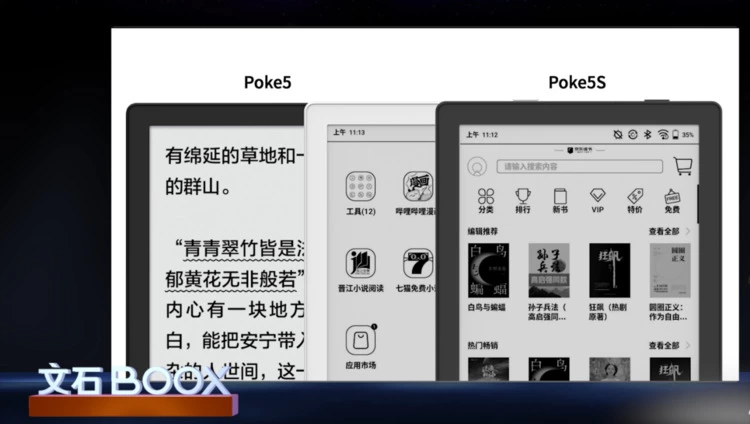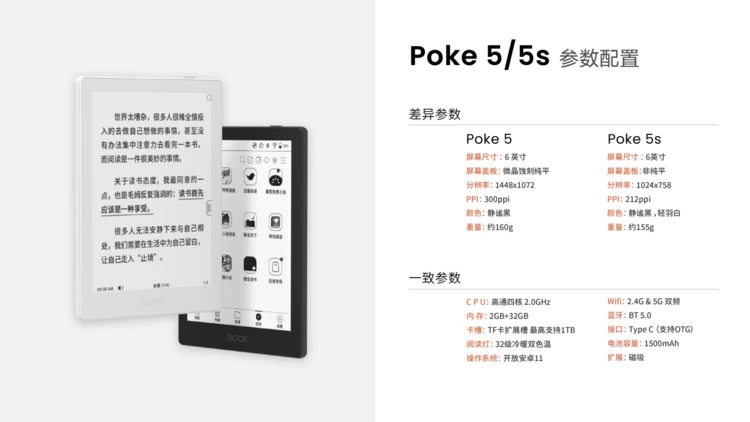 Poke5/5S系列小巧便携,整机约155g左右,比手机重量更轻,6英寸的大小直接可以轻松装进口袋,相当于随身携带了一座图书馆。黑白两种经典配色,黑色低调简约,白色青春时尚。礼盒版的轻羽白限定配色,加上专属定制了“以书为礼”精美阅读礼盒,作为礼物新颖又体面。全系列使用2+32GB内存组合,内置卡槽,至大支持1TB超大内存TF卡。文石的开放系统可以随心所欲安装各种需要的APP应用,微信读书、多看阅读、豆瓣阅读、哔哩哔哩漫画、腾讯动漫……想用哪个装哪个。