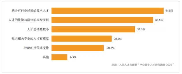 随着行业工业化标准提升,核心骨干人才的获取是游戏企业的主要难题。《报告》调研发现游戏行业企业所面对的关于人才获取的诸多挑战中,44.8%的企业认为缺少有行业经验的技术人才,40.6%的企业认为人才的技能与岗位的匹配度低,33.3%的企业认为人才总体基数少。游戏属于创意密集型行业,人才结构呈现倒三角型,中间层和骨干较基层员工多一些。另外网络游戏队伍本身偏年轻化,也限制了人才池规模,人才队伍断层也更加突出。
