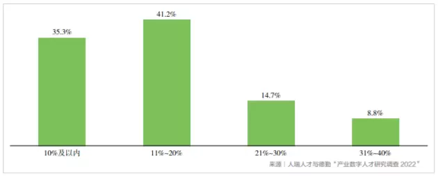 《报告》指出,当前游戏行业人才现状呈现整体供需平衡,长期存在结构性缺口的特点。约六成公司认为目前公司员工供需平衡,但未来三年存在一定人才缺口。其中,35.3%的公司认为未来三年人才缺口在公司总体人才的10%以内,逾4成的公司认为公司人才缺口在公司总体人才的11~20%以内,14.7%的公司认为公司人才缺口在公司总体人才的21~30%以内。