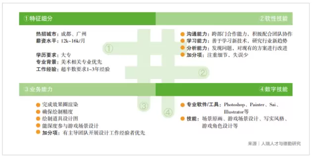 根据当前企业招聘岗位的数量分布、薪酬水平以及不同类型岗位人才紧缺度、行业特征等因素,《报告》识别出原画师、TA技术美术、引擎开发、UE4以及COCOS2D五类关键岗位。面对游戏行业岗位错配、人才队伍断层、中层骨干缺失等难题,《报告》创新推出“井”型数字人才的概念,强调选才“精准”的第一步先从人才与企业对自身需求和实际情况的“科学、客观”认知开始,建立在合理预期的基础上,实现“双向精准匹配”的人才选拔。以“游戏原画师”岗为例,其胜任力模型如下:一是基本特征,包含专业背景、工作经验、热招城市、薪酬水平;二是软性技能,包括沟通、学习、分析能力;三是业务能力,例如确保绘制精度等;四是数字技能,包括掌握场景原画、游戏角色设计等技能。
