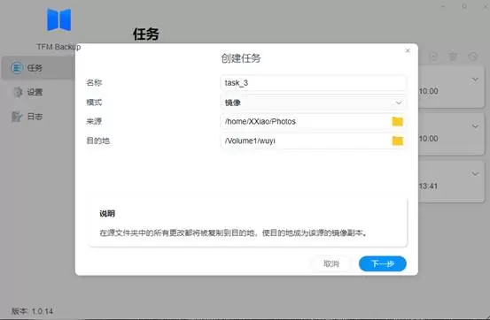 使用方法:1、在应用中心下载TFM Backup之后,打开该应用,创建新任务,选择我们要备份的数据文件夹以及备份到的文件夹目的地,点击下一步。