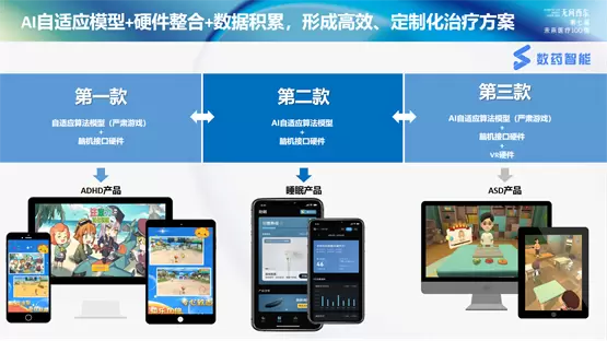 数药智能成熟产品管线《注意力强化训练软件》为治疗干预类严肃游戏,基于临床金标准治疗方式,为患儿提供具有治疗功能的电子游戏类产品。干预训练过程无明显副作用,可以显著改善ADHD症状,克服药物滥用/成瘾危害以及抵触情绪,对于患者及家长更容易长期坚持下去,有效解决了社会资源有限的情况。同时,ADHD产品是取得国内首款医疗器械证的针对治疗ADHD数字疗法产品,创新性地结合大脑前额叶靶向调控、感觉运动统合训练、执行功能训练的技术,以游戏任务为表现形式,改善注意力功能,基于精准的脑区靶向,结合自适应算法,产品可实现高有效性的个性化治疗方案。通过多中心完成GCP临床试验表明,产品显著改善受试者的注意力、多动、学习问题、身心障碍、执行功能等ADHD症状和功能,且无副作用。通过便携式非侵入脑电监测设备产品结合,基于前额EEG信号,实时监测专注度与神经反馈训练。