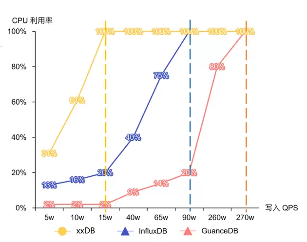实际测试结果都是主机的 CPU 先被打满,此时内存占用和磁盘写入带宽都还有余量,所以我们就以 CPU 利用率为瓶颈指标画出以下对比图: