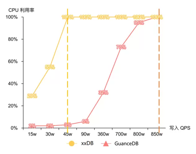 在集群场景下,仍然是 CPU 利用率先达到瓶颈。同样在 CPU 满载情况下,GuanceDB 此时的写入 QPS 约为 860w,xxDB 约为 45w。
