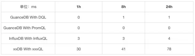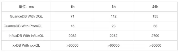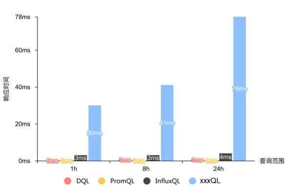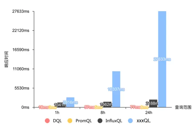 这里我们一共对比了四种查询语法在相同语义的 1h、8h、24h 不同时间范围下的响应时间: