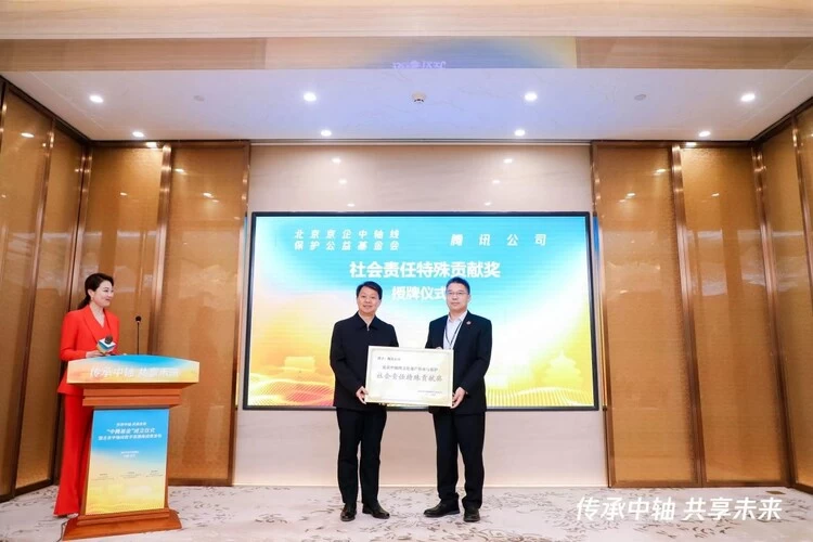 梅松秘书长和腾讯可持续社会价值事业部数字文化实验室负责人舒展作为双方签约代表签署了“中腾基金”捐赠协议。由北京市文物局局长陈名杰向腾讯公益慈善基金会刘洲鸿副秘书长颁发“北京中轴线文化遗产传承与保护社会责任特殊贡献奖”。