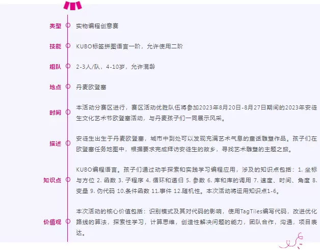 作为丹麦王国中丹儿童友好社区项目的重要组成,本活动获得丹麦创新中心支持,采用KUBO Tagtile标签拼图语言,通过实物编程方式,完成主题任务“拜访安徒生生的故乡”,了解安徒生生平和安徒生故乡,完成角色设计,实践团队合作、编程、创意、示范和自我表达。