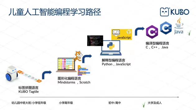 KUBO儿童实物编程课程体系基于C和C++语言,研发TagTile专利少儿无屏编程语言。KUBO少儿无屏编程课程体系与ISTE美国国家教育技术标准和英国国家计算机科学教育标准一致,并已进入北欧地区(丹麦,芬兰,挪威,瑞典)STEAM国家教育体系,同时服务全球30个国家和地区。