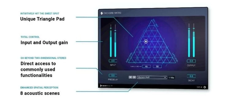 “通过EXOVERB MICRO,我们希望让所有人都能从最新的混响技术中受益,” Dear Reality 产品负责人 Felix Lau 解释道,并补充说,“EXOVERB MICRO 易于使用的界面和三角形显示板为现代音乐和后期制作提供了一个完美的起点。”它能带来自然的混响效果,在所有立体声播放系统(包括音箱和耳机)上均可营造立体的纵深感。