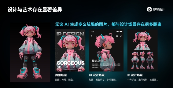 黎嘉宁提到,“即时AI的目标是‘将设计师最需要的技术,以设计师最喜欢的交互方式,一站式提供给设计师’,而设计软件的价值就在于填补技术与场景需求之间的沟壑。”