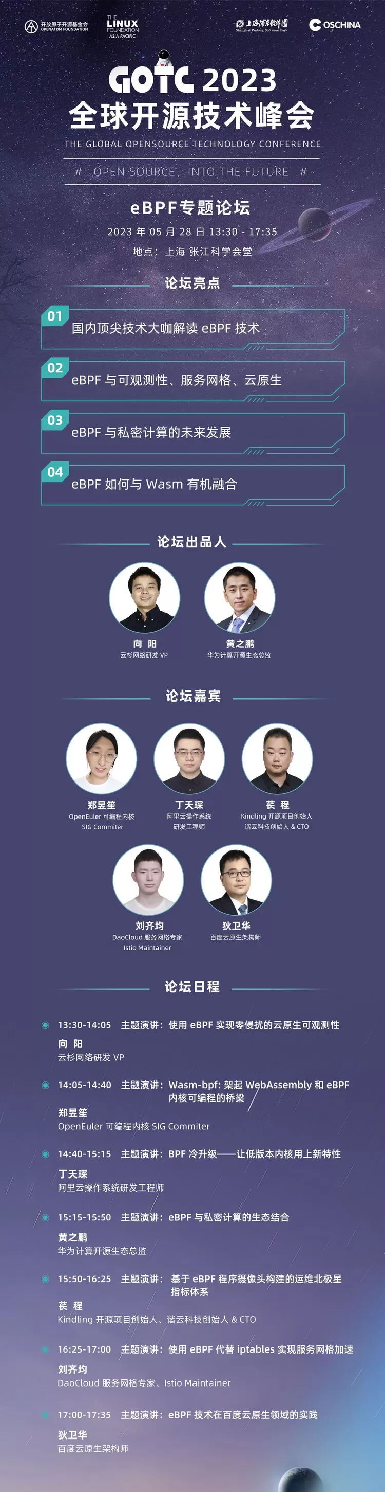 其中,eBPF 专题论坛由云杉网络研发 VP 向阳、华为计算开源生态总监黄之鹏联合担任出品人,将于 5 月 28 日举行。