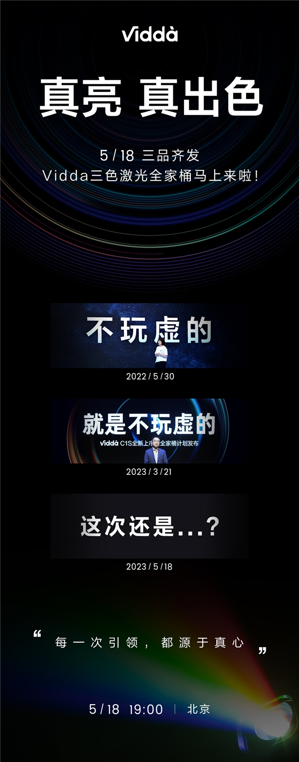 5月9日消息,Vidda官方微博发出海报,宣布将于5月18日召开新品发布会,重磅发布全新三色激光投影产品,Vidda三色激光全家桶全部聚齐。在海报中,Vidda除了喊出“真亮、真出色”的口号,还回顾了前两次新品发布会的主题。有网友根据Vidda一贯的风格,猜测Vidda这次“还是不玩虚的”!