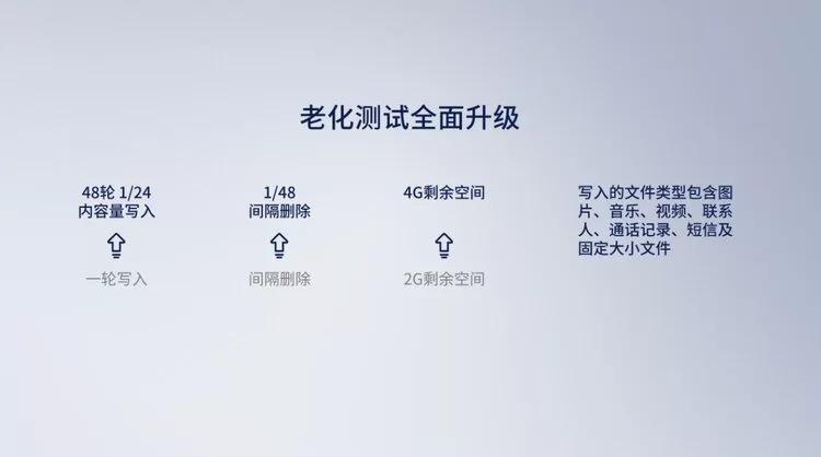 之前的手机老化测试中,采取的是一次性的大量级数据写入和写出,来达成闪存的碎片化以模拟用户使用36个月的状态。在这次升级中鲁大师将写入过程进行优化,由原有的一次性老化升级为48次老化。同时,鲁大师也调整了老化中保留的存储容量,根据最新的用户调研,相比以往主流的128G配置,256G增多,占所有手机用户比例43%,而5%的256G用户使用3年以上剩余空间为4G,所以鲁大师将过去的老化流程中保留的2G空间调整为4G。