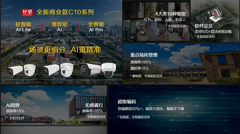 随着高清化的趋势越来越明显,降低存储成本也尤为重要。华为推出SuperCoding超级编码技术,相比于标准H.265可降低50%以上存储空间,且画质不损失、智能不下降,已在C10全智能和轻智能系列落地。