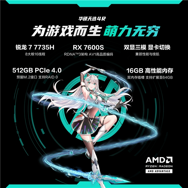 自华硕天选2023新品发布会召开以来,天选4R潮玩游戏本便一直受到玩家关注。作为搭载超威卓越平台的实力产品,其搭载AMD锐龙7 7735H高性能处理器以及由RDNA 3架构打造的Radeon RX 7600S高性能GPU,采用16英寸165Hz高刷电竞屏,外观升级为曜石黑配色,且支持100W PD快充。5月11日,华硕天选4R正式开启预约,首发到手仅需7499元,可享白条三期免息、返百元E卡的首发福利。