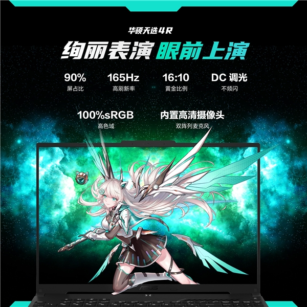 天选4R采用了一块16英寸的165Hz高刷新率电竞屏,采用16:10设计,配合四面窄边框,屏占比高达90%,相比传统16:9屏幕,观感更佳,显示内容更丰富。其同时覆盖100% sRGB色域,并给予玩家生动、艳丽的游戏、追番体验。支持DC调光,杜绝因频闪带来的视觉疲劳。