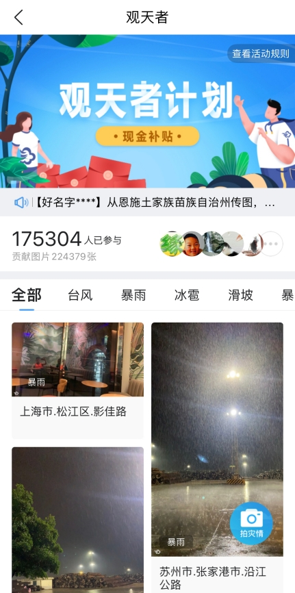 为了积极响应国家号召提高灾害预警信息发布的时效性、准确性,早在2019年,墨迹天气就已推出“观天者计划”, 成为国内首个气象灾情图片实时收集平台。当用户身边出现暴雨、内涝、滑坡、泥石流、暴雪、冰雹、台风、大风、沙尘、大雾等灾情时,可拍摄灾情图片并上传至墨迹时景社区“观天者计划”中,让身边及更多的人第一时间了解灾情情况并采取应急措施。