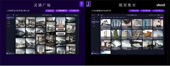 小库科技一站式泛建筑AIGC创享平台中包含三大核心模块:灵感生成、模型训练和共创共享。
