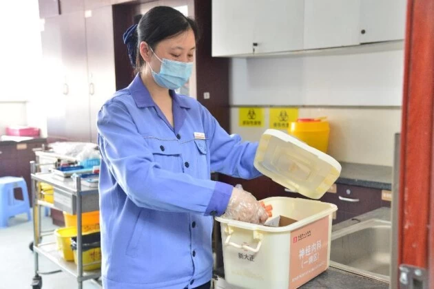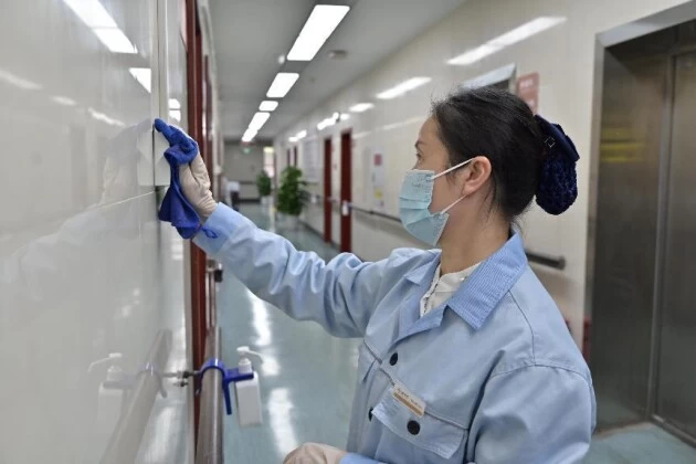 保洁团队每天负责日常清洁消毒、计划清洁开展、以及大型接待。不同于其他保洁,医院对于消毒杀菌的标准有着更加严苛的要求,这就要求团队人员具有更高的专业性:日常的环境消毒都是不低于3次,药剂配比是500毫克兑一公斤水,如果是手术室,一般都是1000毫克兑一公斤水。精确的用量,确保了杀菌消毒的高品质和有效性。