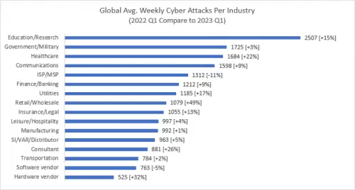 2023 年第一季度,教育/研究部门是重灾区,所遇攻击次数最多,每个机构平均每周遭受 2,507 次攻击,与 2022 年第一季度相比激增 15%。政府/军事部门是第二大攻击目标,平均每周遭受 1,725 次攻击,比去年增加 3%。医疗保健部门所遇攻击次数显著增加,平均每周遭受 1,684 次攻击,同比攀升 22%。零售/批发部门的同比增幅最大,高达 49%,平均每周遭受 1,079 次攻击。