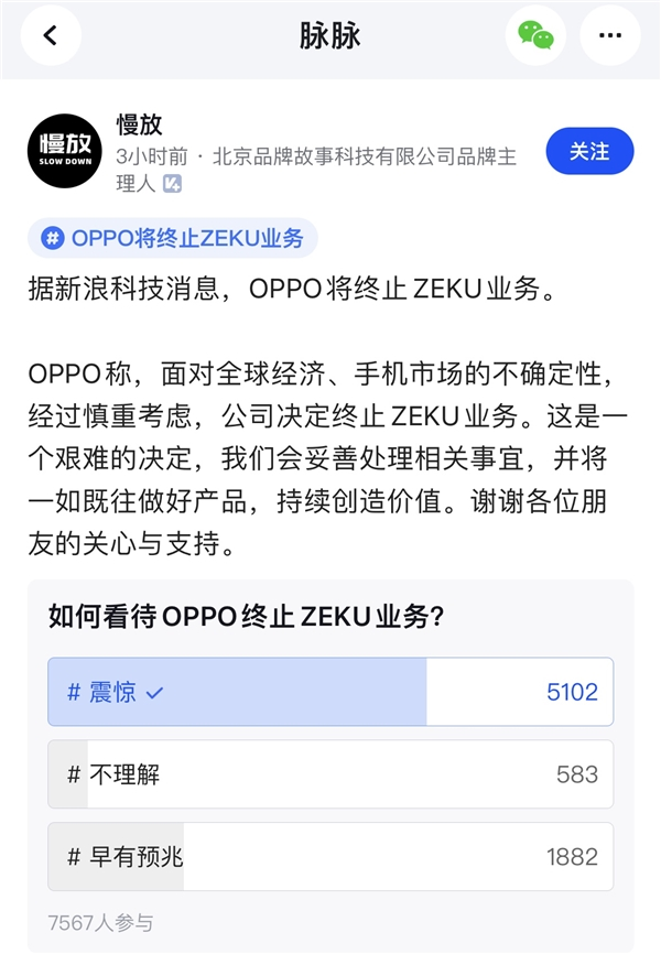 5月12日上午,OPPO将终止旗下芯片设计公司哲库(ZEKU)业务,相关话题迅速在微博、脉脉等多个平台登上热搜。在脉脉上,有用户发布“如何看待OPPO终止ZEKU业务”的问卷,近70%的脉友表示震惊。
