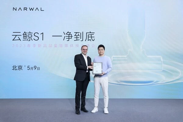 5月9日,云鲸智能创新(深圳)有限公司(以下简称"云鲸")在北京举办云鲸智能洗地机S1新品品鉴暨媒体预沟通会,国际独立第三方检测、检验和认证机构德国莱茵TUV大中华区(以下简称"TUV莱茵")受邀出席,为云鲸智能洗地机S1颁发了高效深度洁净China-mark(中国标识)认证证书。云鲸创始人、CEO张峻彬,TUV莱茵电子电气产品服务全球副总裁郝福来(Frank Holzmann)、大中华区电子电气产品服务区域总经理李永刚、区域总经理曹永新等出席了颁证仪式。