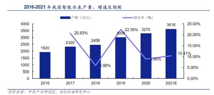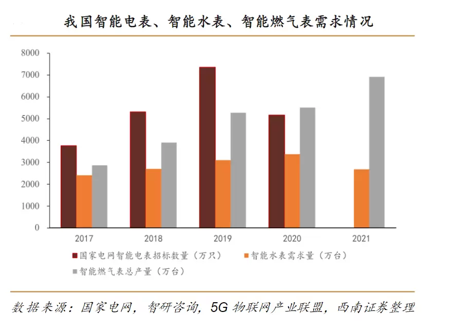截止目前我国已进入智慧城市的爆发式增长期,中国智慧城市工作委员会预测到2022年我国智慧城市市场规模将达到2万亿元。其中,以智能表计为例,在国家电网等部门的大力推动下,2021年我国智能电表、智能燃气表、智能水表的渗透率分别达到了90%、50%、30%。