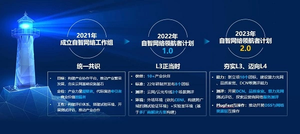 中国信通院持续致力于推动自智网络产业发展。2021年牵头在CCSA TC610推委会、成立自智网络工作组,2022年发布并实施自智网络领航者计划1.0,今年发布的2.0,在“自智等级、业务场景、能力构建和测评方案及PlugFest互操作”方面升级扩展,将进一步推动自智网络产业快速发展。