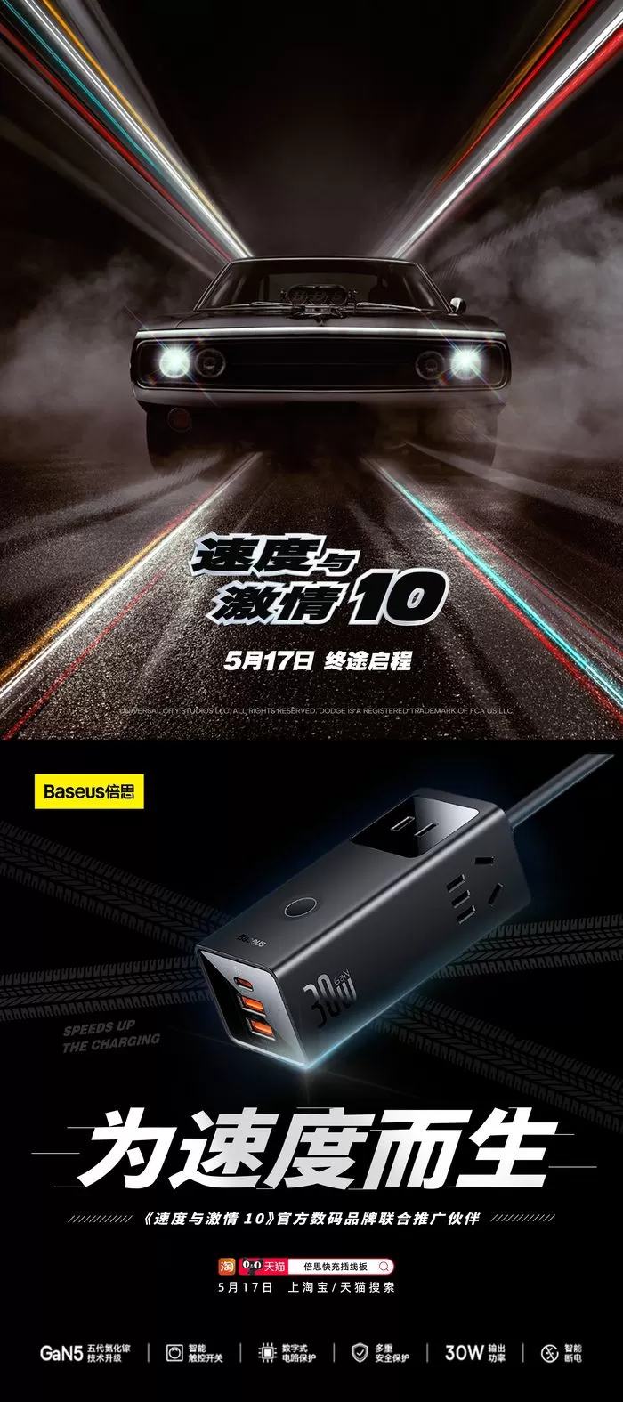 倍思作为《速度与激情10》影片的官方数码品牌合作伙伴,携同样拥有「为速度而生」的拳头产品——快充插线板,联合推出电影限量主题礼盒!这无疑给影迷和数码爱好者带来巨大的惊喜。