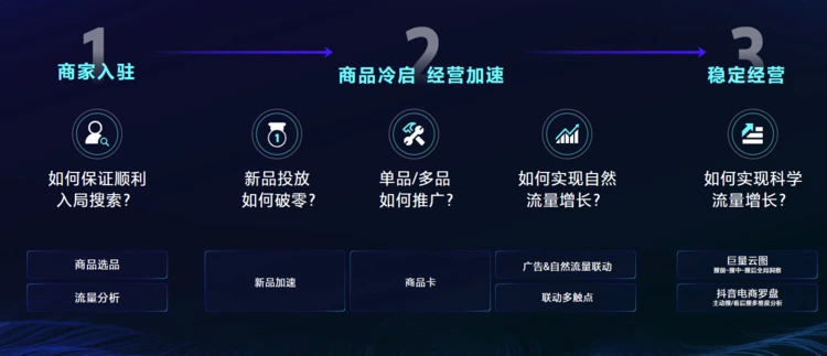 以电商场景为例,不少商家就面临着入局没方向、提速无方法、经营缺支持等问题,为此巨量引擎特别整合了从入驻到经营的一站式服务。如今,电商商家可在商品选品、流量分析、商品卡、电商罗盘、巨量云图等多种产品工具的助力下,一站式解决上述难题,实现生意的稳健增长。